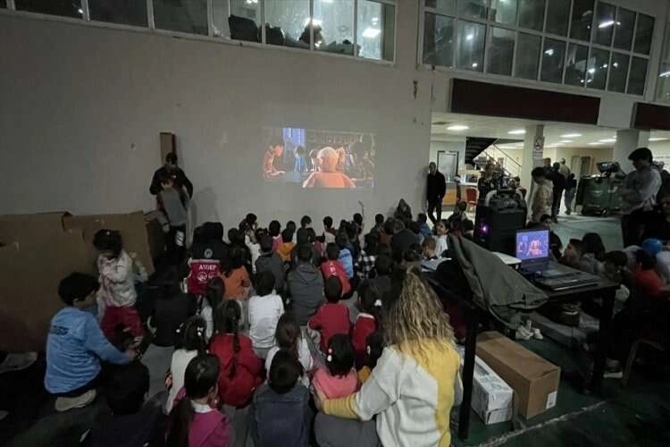 ADANA (AA) - Kahramanmaraş merkezli depremlerden etkilenen vatandaşların barındığı TÜYAP Fuar ve Kongre Merkezi'nde çocuklara sinema gösterimi yapıldı.