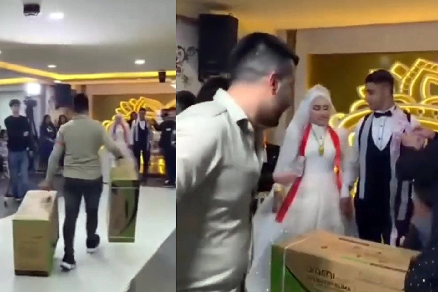 Klimalarla birlikte gelerek hediyesini takdim eden Cumali Yıldırım, düğüne katılanlar tarafından alkışlandı. O anlar, davetliler tarafından cep telefonlarıyla kayda alınırken, salonda gülümseten görüntüler ortaya çıktı.