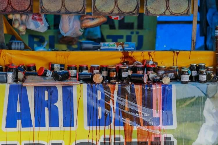 Yaşanan olayda bazı araçların camları kırıldı, tezgahtaki ürünler zarar gördü.