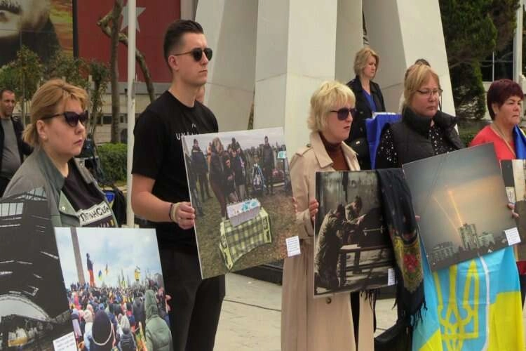 Atatürk Kent Meydanı'nda bir araya gelen Ukraynalılar, Ukrayna ve Türkiye bayrağı açtı, İstiklal Marşı ile Ukrayna Milli Marşı'nı okudu.