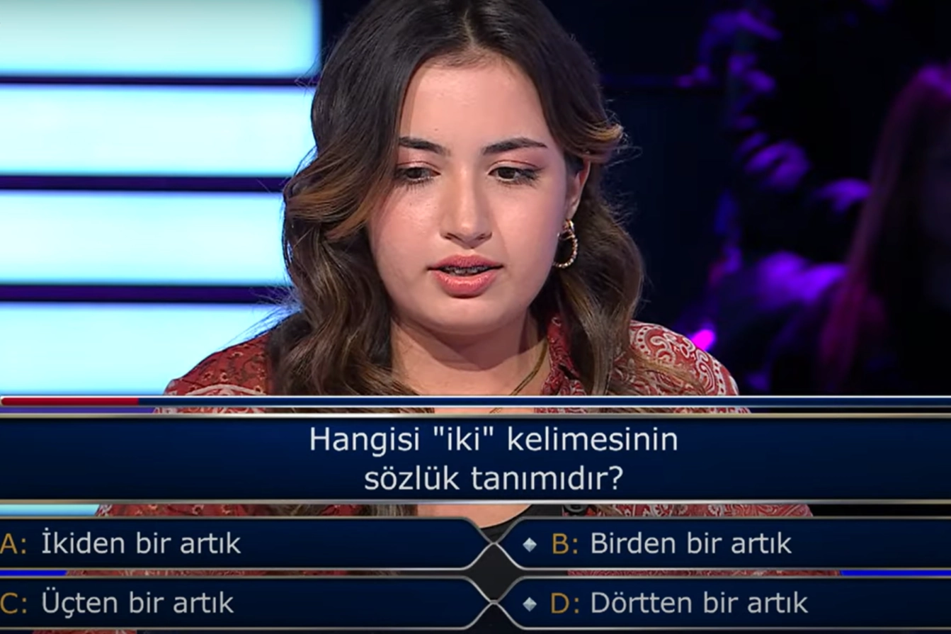 ATV ekranlarında Kenan İmirzalıoğlu'nun sunumuyla ekrana gelen Kim Milyoner Olmak İster'in dün akşam yayınlanan bölümüne Ayşe Naz Babalık isimli yarışmacı damga vurdu. YKS’de Türkiye genelinde eşit ağırlıkta 75. olan Galatasaray Üniversitesi Hukuk Fakültesi hazırlık bölümü öğrencisi Ayşe Naz Babalık, "Hangisi 'iki' kelimesinin sözlük tanımıdır?" sorusunda joker hakkını kullanarak seyirciye sordu. Seyircinin "Birden bir artık" yanıtını vermesi ile sonraki soruyu açtıran yarışmacı, sesli soruda elenerek 5 bin lira ödülle yarışmadan elendi.