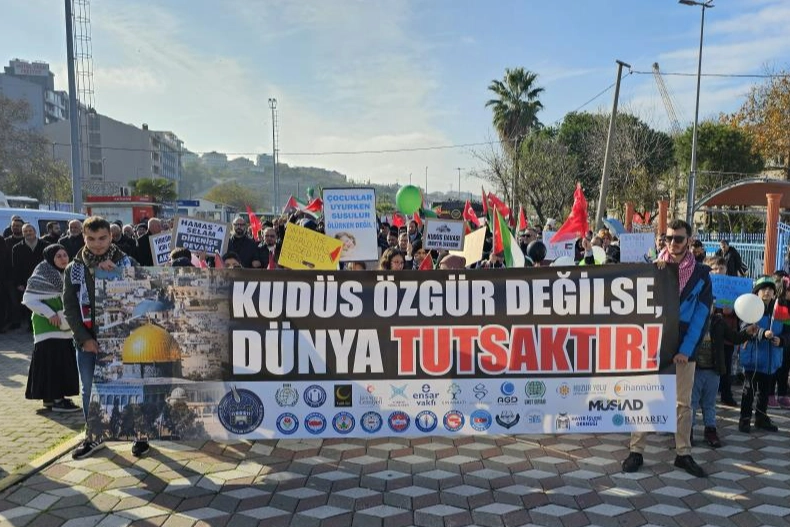 Balıkesir'in Bandırma ilçesinde 10 Aralık İnsan Hakları Günü'nde İsrail'e tepki, Filistin'e destek amacıyla yürüyüş gerçekleştirildi.