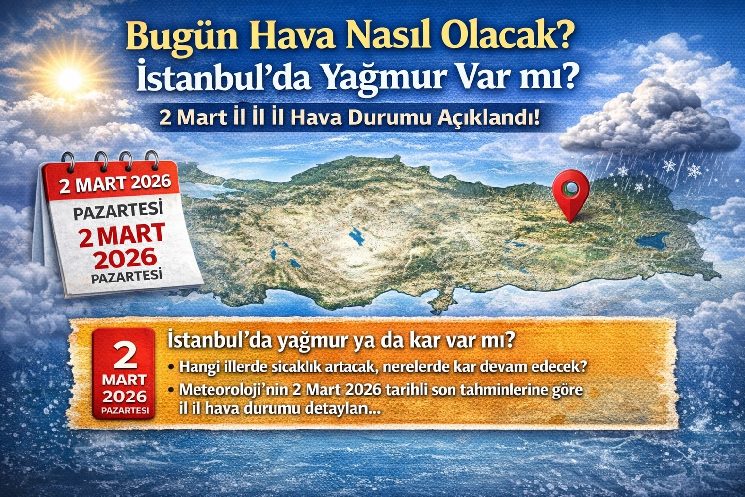 BUGÜN HAVA NASIL OLACAK? (2 MART 2026)Meteoroloji Genel Müdürlüğü’nün son değerlendirmelerine göre Türkiye genelinde hava durumu bölgelere göre değişiklik gösteriyor. Ülkenin kuzeydoğu kesimlerinde yağış beklenirken, diğer bölgelerde parçalı ve az bulutlu bir hava hakim olacak.