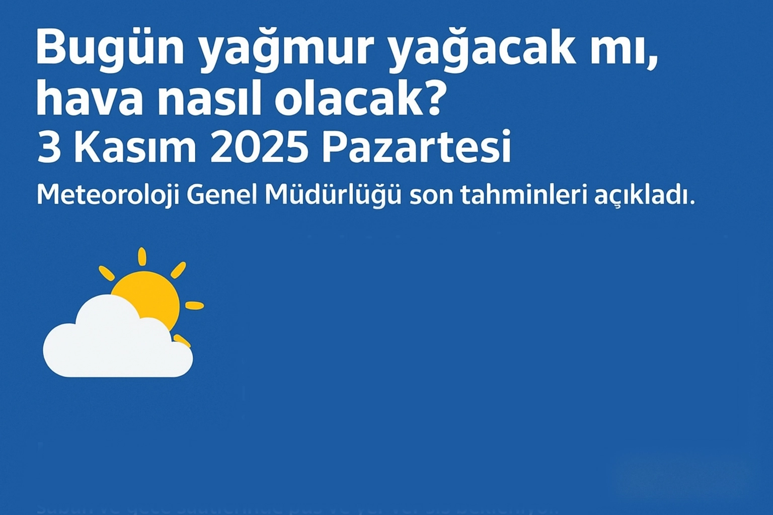 Meteoroloji Genel Müdürlüğü 3 Kasım 2025 Pazartesi gününe ait son hava durumu tahminlerini paylaştı. Buna göre bugün Türkiye genelinde yağış beklenmiyor. Marmara, Ege ve İç Anadolu başta olmak üzere birçok bölgede sabah ve gece saatlerinde pus ve yer yer sis etkili olacak. Hava sıcaklıklarının ise mevsim normallerinin üzerinde seyretmeye devam edeceği tahmin ediliyor.