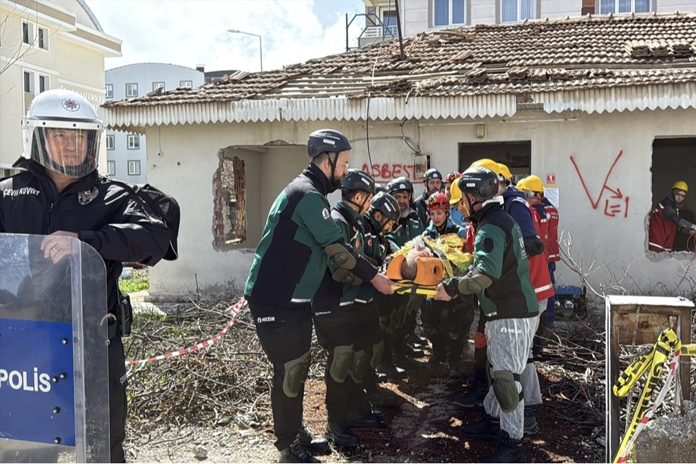 Bağlar Mahallesi'ndeki enkazda kalan 3 kişiyi kurtarmak için bölgeye arama kurtarma ekipleri sevk edildi. Ekipler, senaryo gereği enkazdan çıkardıkları yaralıları ambulanslara hastaneye kaldırdı, hayatını kaybeden kişi ise cenaze aracına taşındı.