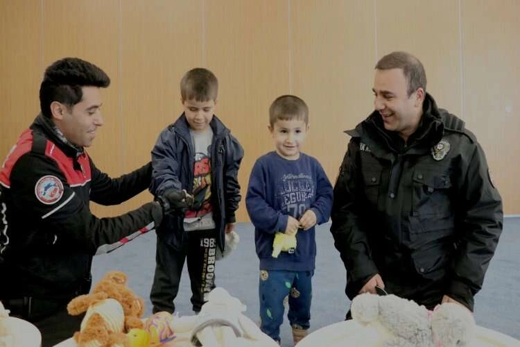 Emniyet Müdürlüğü ekipleri, Gençlik ve Spor Bakanlığı (GSB) Asımın Nesli ve Safahat yurtlarında kalan depremzedeleri ziyaret etti. Çocuklara oyuncak hediye eden polisler, sohbet edip, fotoğraf çektirdi.