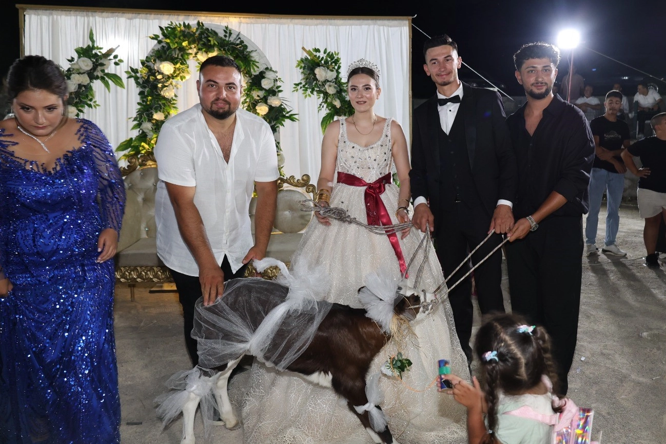 Çanakkale'nin Ayvacık ilçesinde düzenlenen bir düğünde sıra dışı bir hediye dikkat çekti. Panayır Yeri Alanı’nda yapılan düğünle hayatlarını birleştiren Bekir ve Ece Tunç çiftine, sağdıçları Hüseyin Yılmaz ve Taha Çintirli tarafından takı töreninde simental cinsi bir buzağı hediye edildi. Damat Bekir Tunç, hediye için sağdıçlarına teşekkür ederek, buzağının süslenerek takıya çıkarılması renkli görüntüler oluşturdu. Buzağının Tunç ailesinin çiftliğinde sürüye dahil edileceği belirtildi.