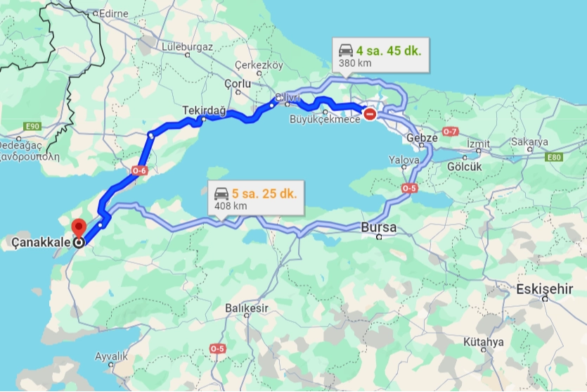 İstanbul ile Çanakkale arasındaki mesafe 307,3 kilometredir. Bu mesafe, iki şehir arasında Tekirdağ üzerinden gidildiğinde geçerlidir. İstanbul ile Çanakkale arasındaki ulaşım süresi ise tercih edilen ulaşım aracına göre değişiklik göstermektedir.