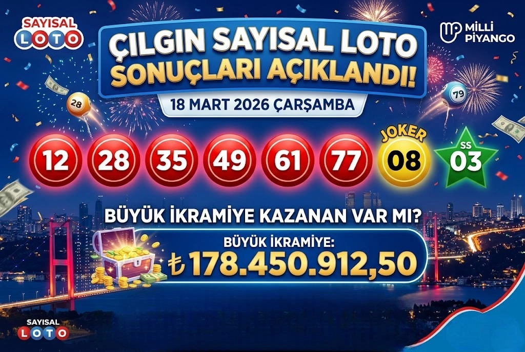 18 Mart Çarşamba günü gerçekleşen Çılgın Sayısal Loto çekilişinde 6 bilen çıkmayınca 781 milyon TL devretti. İşte 18 Mart 2026 Çılgın Sayısal Loto kazanan numaralar ve sonuç sorgulama ekranı.18 Mart 2026 Çılgın Sayısal Loto sonuçları, Milli Piyango Online üzerinden erişime açıldı. Haftanın ikinci canlı çekilişi, Sisal Şans tarafından noter huzurunda gerçekleştirildi ve Milli Piyango TV Youtube kanalından canlı yayınlandı.
