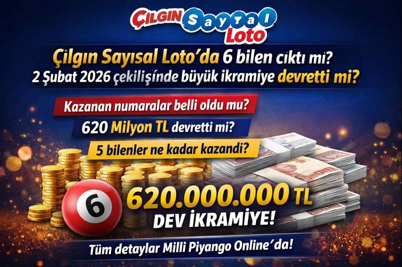 ÇILGIN SAYISAL LOTO’DA BÜYÜK İKRAMİYE DEVRETTİ2 Şubat 2026 tarihli Çılgın Sayısal Loto çekilişinde 6 bilen çıkmadı. Bu nedenle büyük ikramiye 620.001.909,29 TL’ye yükselerek bir sonraki çekilişe devretti. Öte yandan 5 bilen 3 talihli, kişi başı 4.339.881,35 TL ikramiye kazandı.