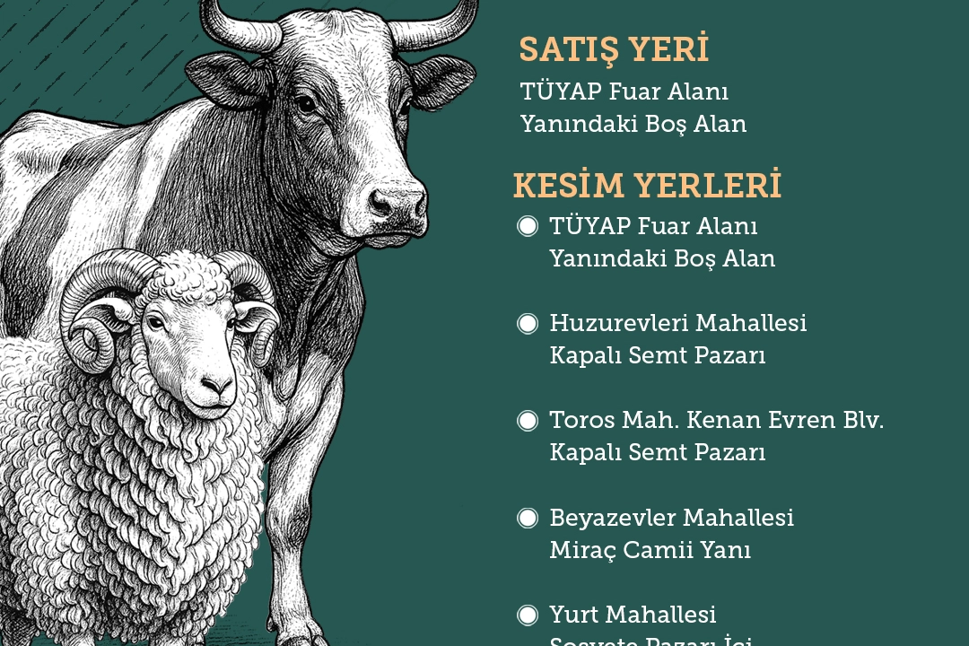 Ücretsiz kurban kesim hizmeti beş noktadaÜcretsiz kesim hizmetinin ise Yurt Mahallesi Sosyete Pazarı İçi, Toros Mahallesi Kenan Evren Bulvarı Semt Pazarı, Huzurevleri Mahallesi Kapalı Semt Pazarı, Beyazevler Mahallesi Miraç Camii Yanı ve Yüzüncüyıl Mahallesi Fuar Alanı yanındaki boş alanda verileceği kaydedildi.