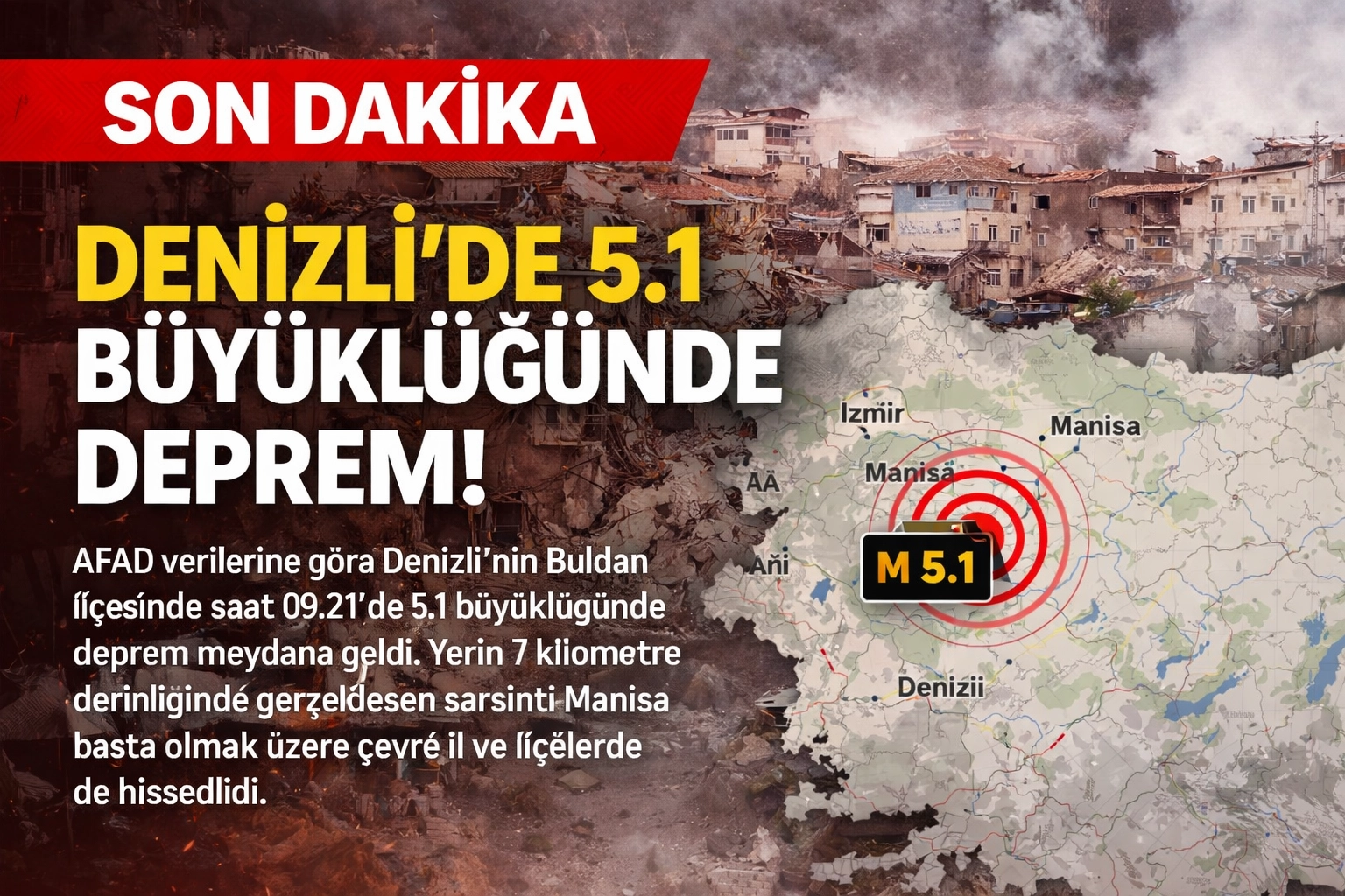 DENİZLİ’DE 5.1 BÜYÜKLÜĞÜNDE DEPREMAfet ve Acil Durum Yönetimi Başkanlığı (AFAD) tarafından paylaşılan bilgilere göre Denizli’de 5.1 büyüklüğünde deprem meydana geldi. Depremin merkez üssünün Denizli’nin Buldan ilçesi olduğu açıklandı.Saat 09.21’de meydana gelen depremin yerin yaklaşık 7 kilometre derinliğinde gerçekleştiği bildirildi.