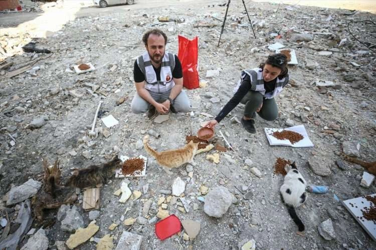 Türk Veteriner Hekimleri Birliği eş güdümündeki çalışmalar kapsamında, enkaz bölgeleri ile yaşam alanlarının çevresindeki kedi ve köpek gibi sahipsiz hayvanlar için mama bırakılıyor.