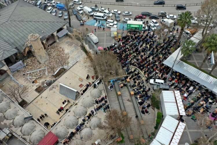 KAHRAMANMARAŞ (AA) - Depremin merkez üssü Kahramanmaraş'ta cuma namazı, minaresi yıkılıp bir bölümü hasar gören, Milli Mücadele döneminde bağımsızlık ateşinin yakıldığı Ulu Cami'nin yanındaki alanda kılındı.