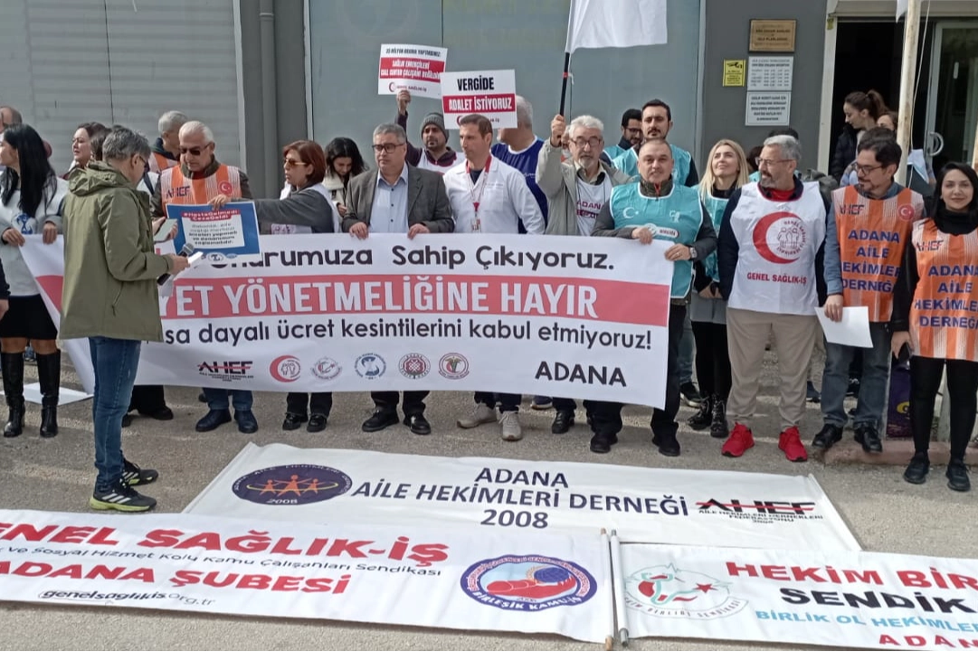 Adana Tabip Odası, Sağlık ve Sosyal Hizmet Emekçileri Sendikası (SES) Adana Şubesi, Genel Sağlık-İş Sendikası Adana Şubesi, Hekim Birliği Sendikası ve Aile Hekimleri Dernekleri Federasyonu (AHEF) tarafından basın açıklaması gerçekleştirildi. Açıklama, Kurttepe Aile Sağlığı Merkezi (ASM) önünde yapıldı. Çok sayıda sağlık çalışanlarının katıldığı basın açıklamasında açıklamayı katılanlar adına Adana Aile Hekimleri Derneği Genel Sekreteri Uzman Dr. Kayhan Süreyya İşgüzar okudu. Sağlık çalışanları ve halkın mağdur olacağı vurgulanarak, birinci basamak hizmetlerin kamusal bir anlayışla yürütülmesi gerektiği belirtildi.