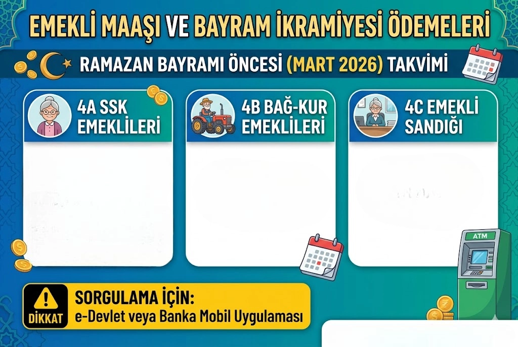 EMEKLİ MAAŞI ÖDEMELERİ NE ZAMAN YAPILIYOR?2026 yılında Ramazan Bayramı 20 Mart Cuma ile 22 Mart Pazar günlerine denk geliyor. Emeklilere bayram ikramiyesi ve maaş ödemeleri ise 14 Mart itibarıyla başladı.