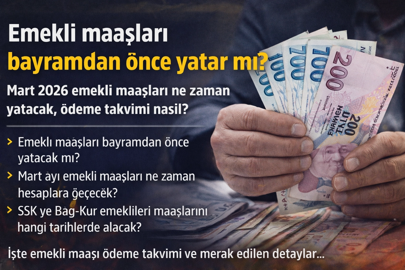 EMEKLİ MAAŞLARI BAYRAMDAN ÖNCE YATACAK MI?2026 yılında Ramazan Bayramı 20 Mart’ta kutlanacak. Emekliler maaşlarının bayramdan önce hesaplarına yatırılmasını beklese de Çalışma ve Sosyal Güvenlik Bakanlığı ile Sosyal Güvenlik Kurumu (SGK) tarafından henüz bu konuda resmi bir açıklama yapılmadı.