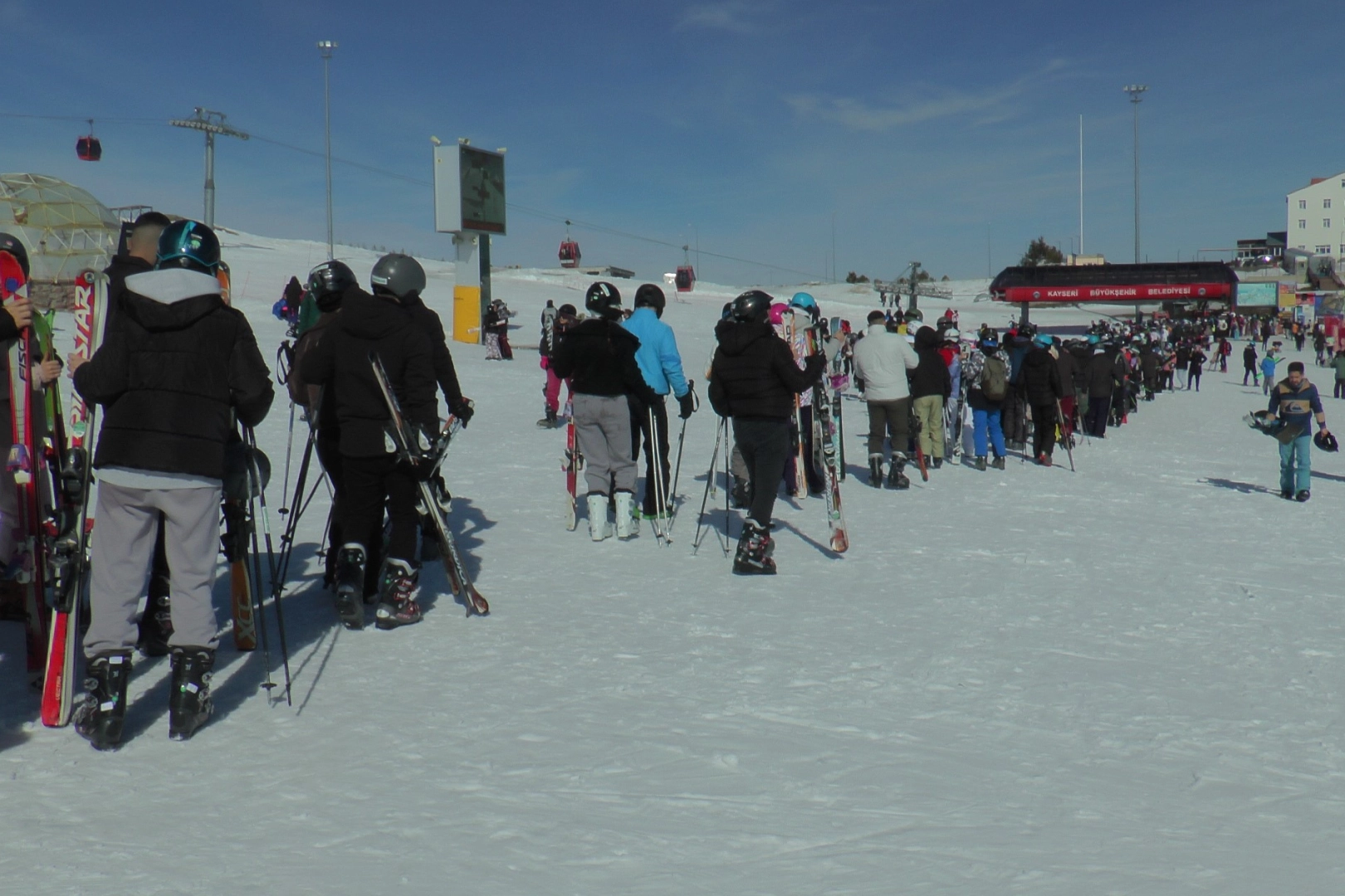 Kış turizminin önemli merkezlerinden olan Erciyes Kayak Merkezi misafirlerini ağırlamaya devam ediyor. Yerli ve yabancı turistlerin akınına uğrayan Erciyes, hafta sonunu dolu dolu geçirdi. Binlerce kayakseverle dolan Erciyes’te teleferik sırasında da uzun kuyruklar oluştu. Konya’dan Erciyes’e kayak yapmaya gelen Emine Yılmaz, "Kayakta ilk deneyimim. Bugün ikinci günüm. Dün biraz pratik yaptık. Erciyes’i çok beğendim. Burası hafta sonu olması nedeniyle çok yoğun. Herkesi bekleriz" şeklinde konuştu.