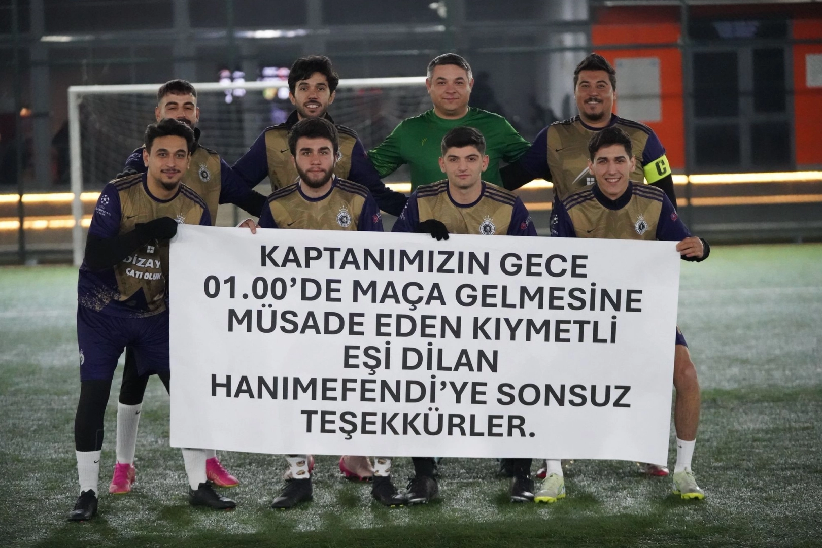 "EVLİ OLDUĞUNUZ ZAMAN EŞİNİZİ DE DÜŞÜNMENİZ GEREKİYOR"Arkadaşları tarafından hazırlanan pankartın kendisi için sürpriz olduğunu aktaran Sami Can Gültekin, "Takım arkadaşlarımızla 10 yıldır beraber futbol oynuyoruz. Bizim bir konuşma grubumuz var. Maçın saat gece 01.00’da olduğunu öğrenince gruba gelemeyebilirim diye mesaj attım. Daha önce de böyle şeyler yaşadık. Evli olduğunuz zaman eşinizi de düşünmeniz gerekiyor. Daha sonrasında eşim müsaade edince maça gelebileceğimi gruba yazdım. Arkadaşlarım da akşama böyle bir sürpriz hazırlamışlar, benim de bilgim yoktu. Normalde hep oynadığımız saatlerde ama şimdi dediğim gibi evlendikten sonra bu işler iki taraflı oluyor, tek taraflı karar veremiyorsunuz. Sonrasında maça geldim tabii ki müsaade aldım. Pankartı eşime göstermek için eve getirdim. Daha sonrasında bir video çektik, sosyal medyada ilgi odağı oldu. Mutluyuz, herkes eğlenmeye, hayattan keyif almaya baksın. Tepki gösterecek bir şey yok" dedi.