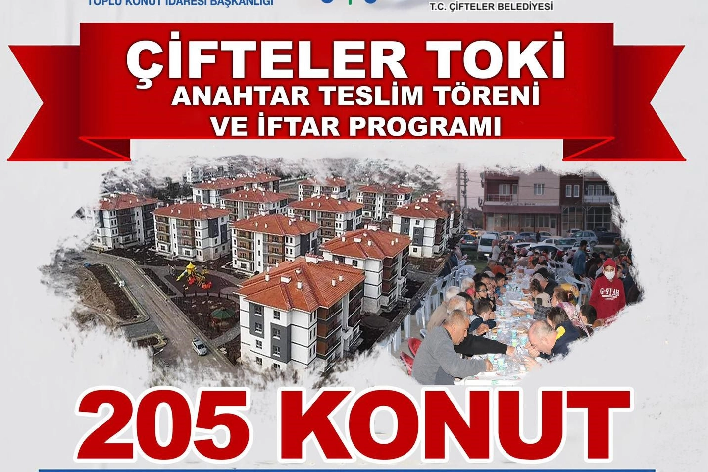 Çevre ve Şehircilik Bakanlığı'na bağlı TOKİ tarafından Çifteler İlçesi'nde inşa edilen yeni konutlar yarın sahipleriyle buluşturulacak. Saat 18.00'da bir düğün salonunda düzenlenecek olan törende ve iftar programında 205 konutun anahtarı vatandaşlara teslim edilecek. Çifteler Belediyesi tarafından organize edilen etkinliğe Belediye Başkanı Kadir Bıyık da katılım gösterecek.