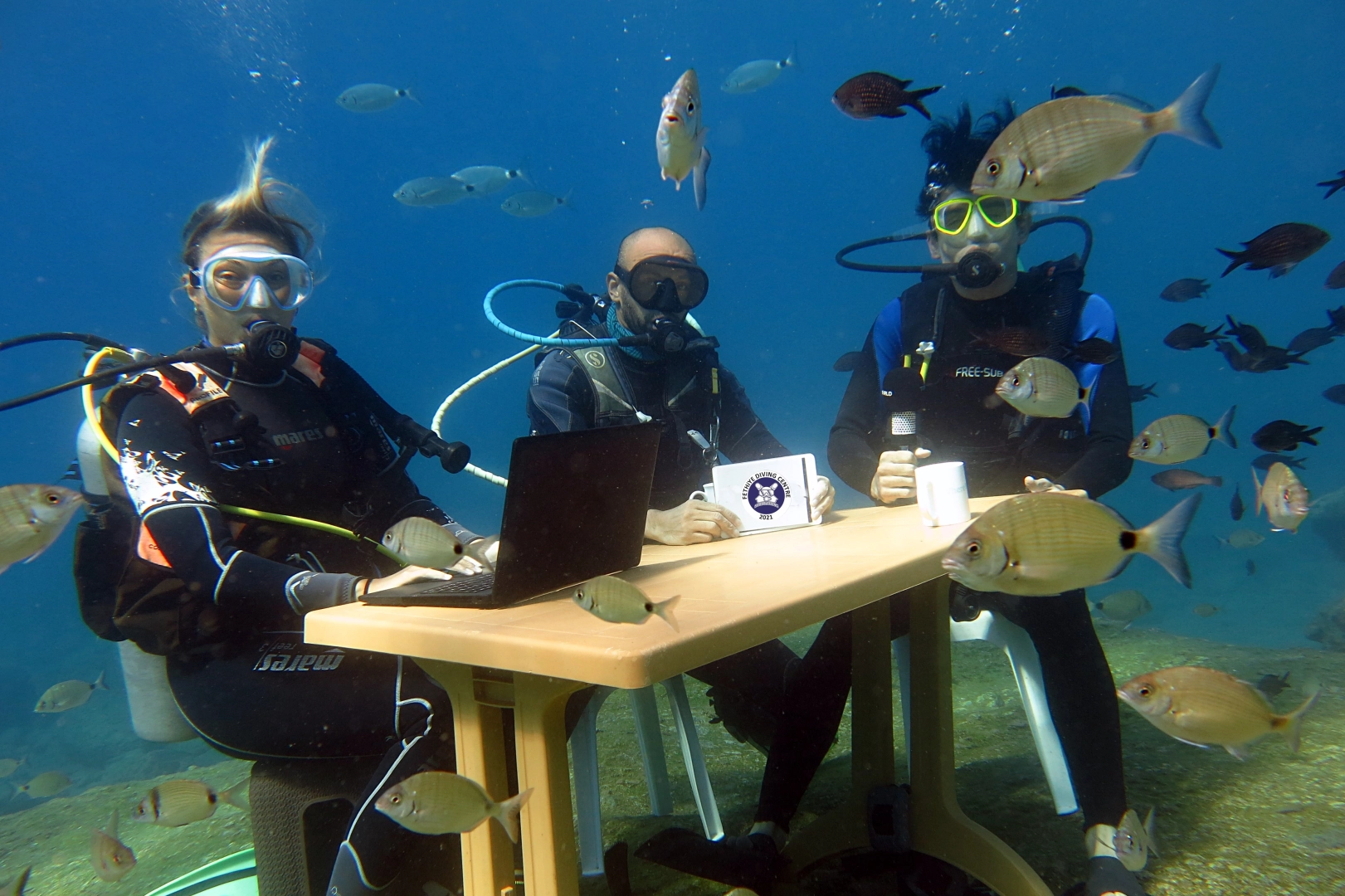 Dalgıçlar, su altında kurdukları masada toplanarak, turizm sezonunu değerlendirme toplantısı yaptılar. Su altı kamerasıyla kaydedilen bu anlamlı etkinlikte, bir dalgıç diğerinin sorularını cevaplandırırken diğer dalgıç da bilgisayara notlarını aldı.