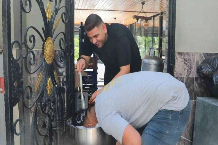 Yazın bol bol soğuk içecek tükettiklerini kaydeden ustalar, serinlemek için ise kafalarını buzlu suya sokup hortumla serinlemeye çalışıyor.