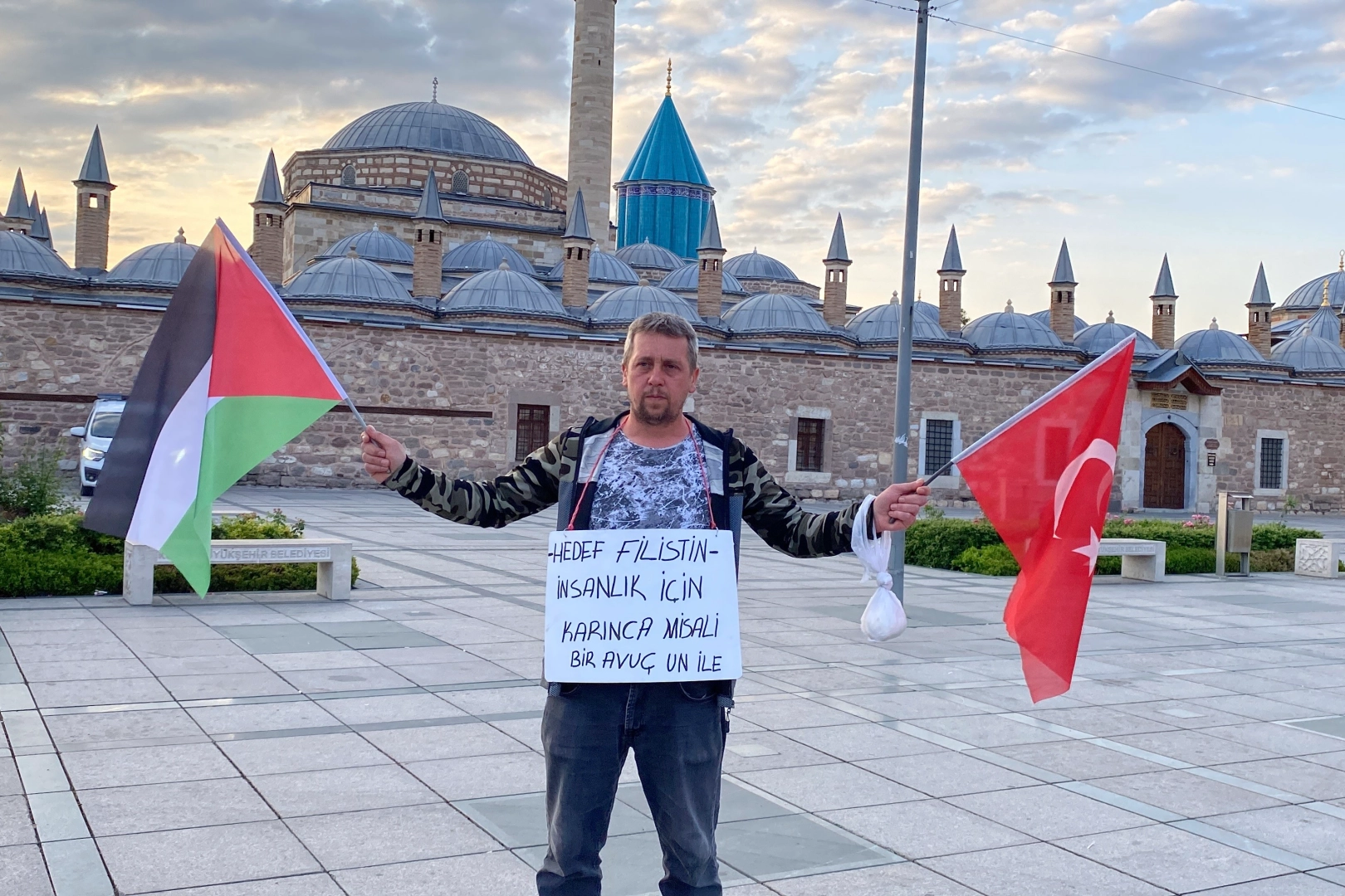 Eskişehirli İrfan Başkaya, iki çocuğunu eşine emanet ederek Gazze’deki savaşın sona ermesi için tek başına yürüyüşe çıktı. İsrail saldırılarına karşı destek amacıyla 5 gün önce başlattığı yürüyüşünde Babalar Günü’nde Konya’ya ulaşan Başkaya, burada Sultan Selim Camisi’nde sabah namazını kıldıktan sonra Adana’ya doğru yoluna devam edeceğini açıkladı.