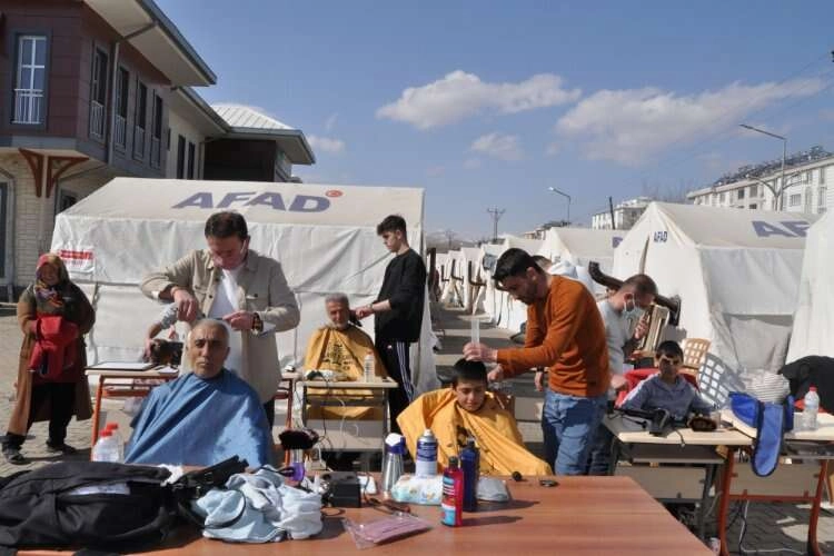 Çorum Berberler, Kuaförler ve Güzellik Salonu İşletmecileri Odası'na bağlı 45 gönüllü berber ve kuaför, Afşin'de çadır kentlerde kalan depremzedelerin tıraşını ve kişisel bakımını yaptı.