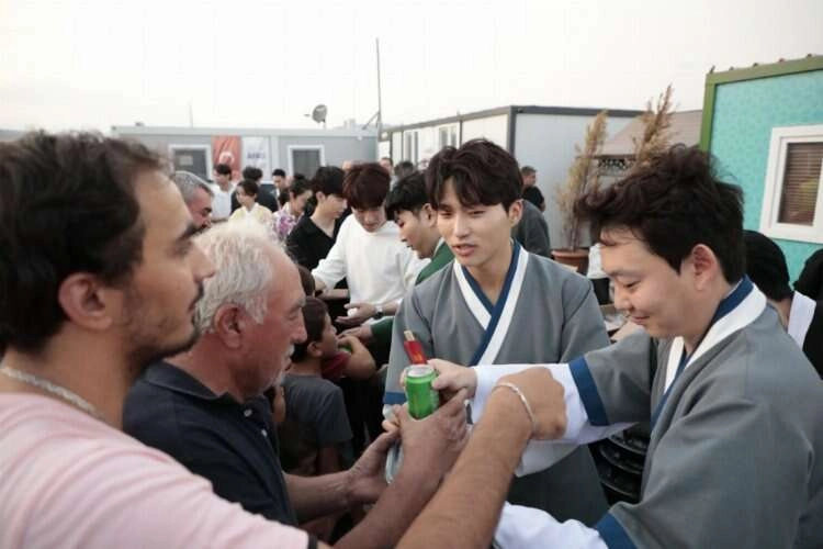 Güney Kore'nin bazı yöresel yemeklerini yerel kıyafetlerini giyerek depremzede ailelere dağıtan sanatçılar, afetzede ailelerle hatıra fotoğrafı çektirdi.