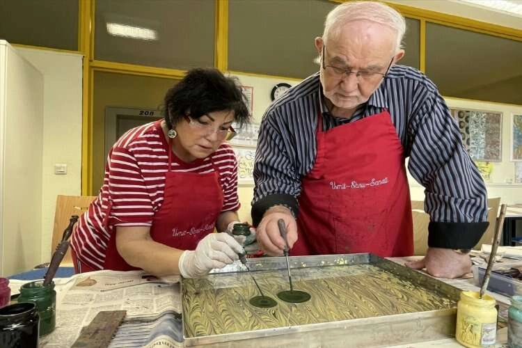 Kendilerini geliştirerek Almanya'ya dönen çiftten Ümit Gümrükçü, Nürnberg Belediyesinin sanat merkezinde ebru kursu açtı.