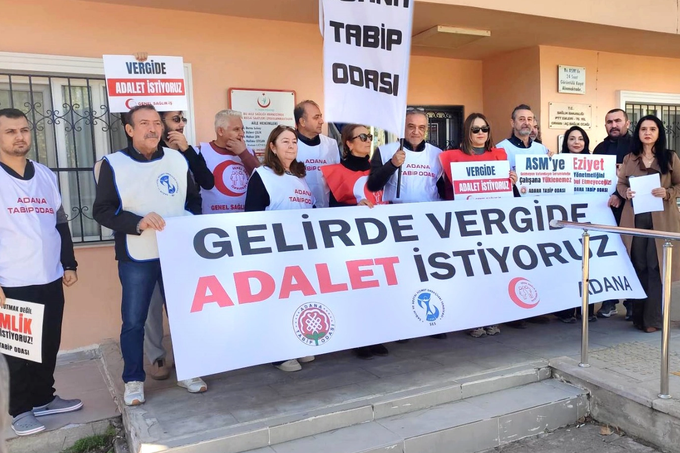 Adana Tabip Odası (ATO), Sağlık ve Sosyal Hizmet Emekçileri Sendikası (SES) ile Genel Sağlık-İş Sendikası yönetici ve üyeleri, PTT Evleri Orhan Taç Aile Sağlığı Merkezi önünde “Gelirde, Vergide Adalet İstiyoruz” başlıklı basın açıklaması düzenledi. Çok sayıda sağlık çalışanının katıldığı açıklamada, ortak metni SES Adana Şube Başkanı Şükran Güzel okudu.