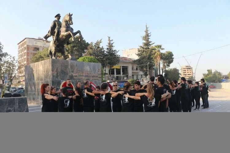 Cumhuriyet Alanı'nda bulunan Atatürk Anıtı önünde gerçekleşen gösteride gönüllü 100 kişiden oluşan ekip "Cumhuriyet'in 100 yılında 100 beden tek ruh" sloganıyla zeybek oynadı.