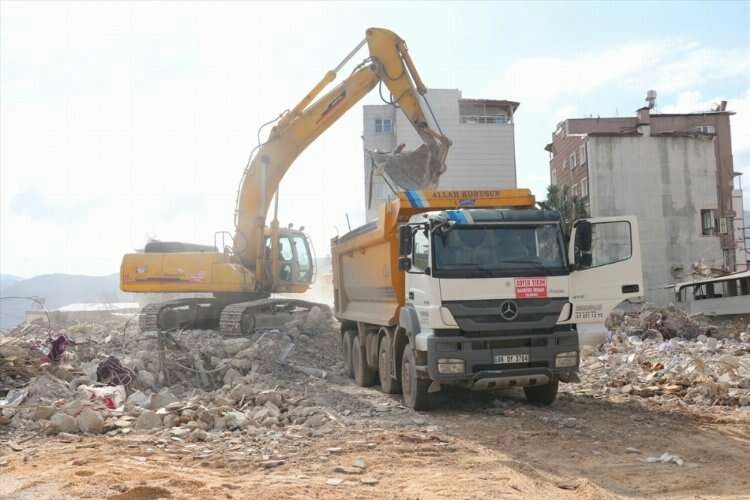 Merkez Antakya ilçesinde depremlerde yıkılan ya da ağır hasarı olduğu için yıkım kararı alınan binalarda enkaz kaldırma çalışmaları ekiplerce gerçekleştiriliyor.