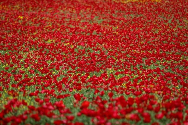 Kahramanmaraş merkezli 6 Şubat'taki depremlerden etkilenen ilçedeki tarlalar, doğada kendiliğinden yetişen gelinciklerin açmasıyla kırmızıya boyandı.