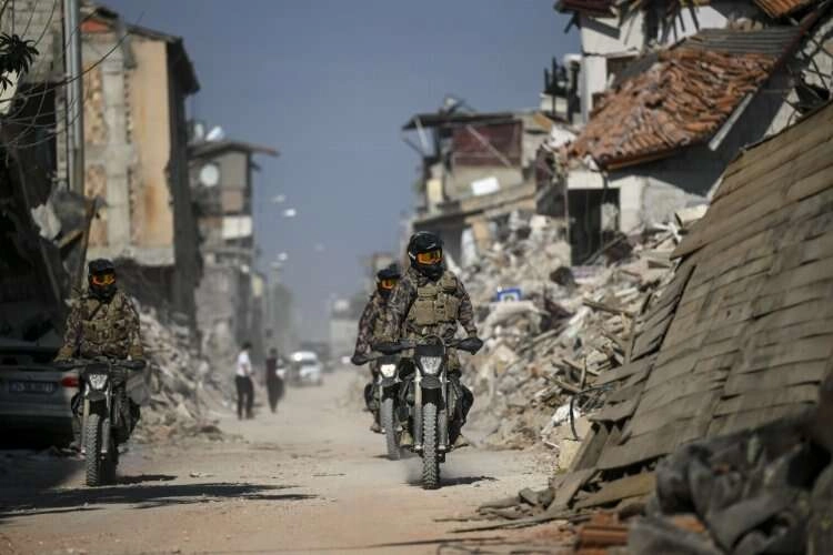 Hatay'da görevlendirilen Emniyet Genel Müdürlüğü Özel Harekat Daire Başkanlığı bünyesindeki özel harekat polisleri, yıkılan binalar nedeniyle kapanan sokaklarda veya araç giremeyen mahallelerde kros motosikletleriyle devriye geziyor.