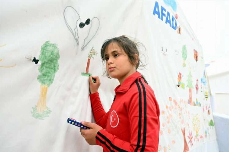 10 yaşındaki Ecrin Kübra Cilveli ise resim yapmanın hoşuna gittiğini ve bu yüzden kaldıkları çadıra sevdiği çizgi film karakterlerini resmettiğini söyledi.