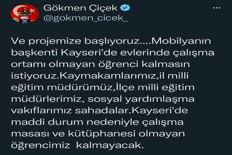 Vali Gökmen Çiçek, müjdeyi sosyal medya hesabından paylaştı. Çiçek paylaşımında; "Ve projemize başlıyoruz. Mobilyanın başkenti Kayseri’de evlerinde çalışma ortamı olmayan öğrenci kalmasın istiyoruz. Kaymakamlarımız, il milli eğitim müdürümüz, ilçe milli eğitim müdürlerimiz, sosyal yardımlaşma vakıflarımız sahadalar. Kayseri’de maddi durum nedeniyle çalışma masası ve kütüphanesi olmayan öğrencimiz kalmayacak" ifadelerini kullandı.