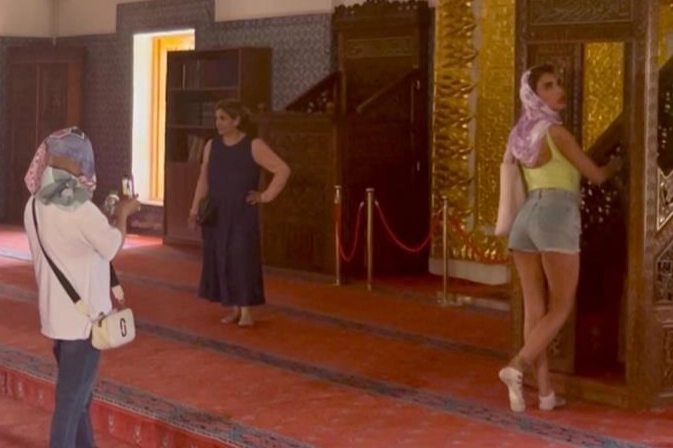 Minber önünde kısa şortlu pozGeçtiğimiz hafta yapılan uyarılara rağmen camideki durum kontrol altına alınmadı. Caminin önüne başörtü bırakılırken, bazı İranlı turistler başörtüsü taktı ancak etek giymedikleri için minber önünde kısa şortla fotoğraf çektirdikleri görüldü.