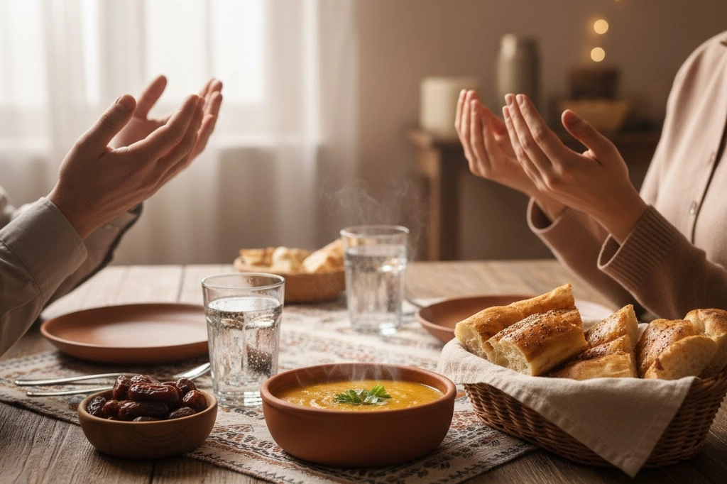 ORUCU AÇARKEN DİKKAT EDİLMESİ GEREKENLERİlk olarak susuzluğu gidermek önemlidir. 1 bardak su ve birkaç hurma ile iftar başlanabilir.Ardından ılık çorba ve ekmekle ana öğüne geçmeden 15–20 dakika ara verilmelidir.Ağır yağlı, kızartma ve yüksek kalorili yiyeceklerden uzak durulmalıdır. Yiyecekler yavaş yavaş ve iyice çiğnenerek tüketilmelidir.İftar duası ve Ramazan ayının bereketi, hem bireysel hem de toplumsal olarak yardımlaşma, şükür ve dayanışma iklimini güçlendirir. Müslümanlar için iftar, sadece açlıklarını gidermek değil, dua ve şükürle ruhlarını da doyurma zamanıdır.