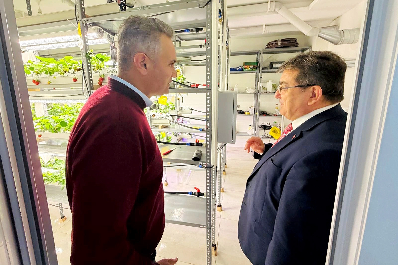 Ziyaret kapsamında topraksız tarım yöntemiyle gerçekleştirilen üretim süreçlerini yakından gözlemleyen Karadağ, tesis yetkililerinden modern tarım teknikleri ve uygulamaları hakkında detaylı bilgi aldı.