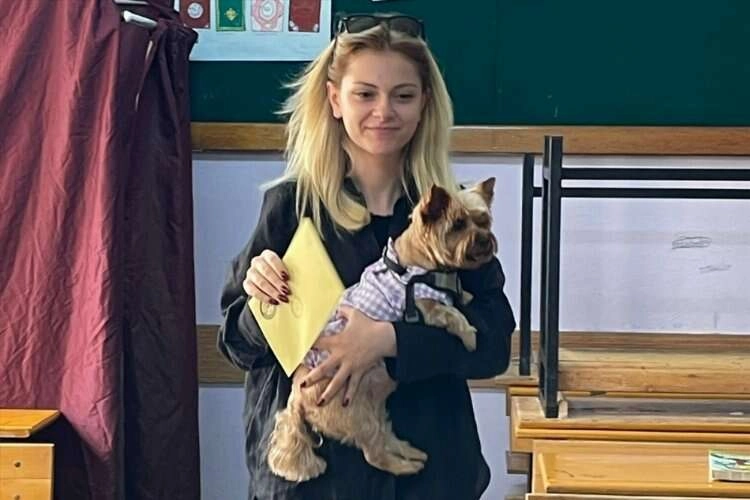 İlk kez oy kullanacağı Barbaros İlkokuluna annesi ve "Mia" isimli köpeğiyle gelen İrem Ayşe Bazoğlu, ilgi çekti.
