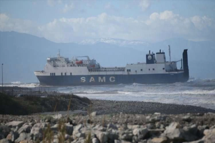 HATAY (AA) - İskenderun Körfezi'nde yaklaşık 8 yıldır demirlemiş halde bulunan hacizli gemi, fırtına nedeniyle karaya oturdu.