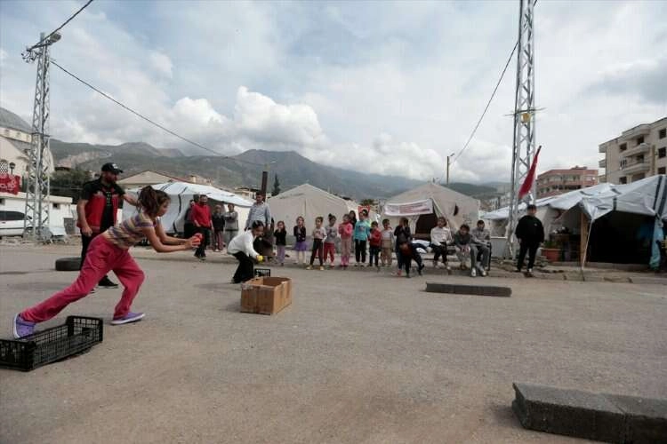 Çocuklara kukla ve boyama etkinlikleri düzenleyen Aydın'dan gelen ekipler, ufak depremzedeleri mutlu etmek için çadır kentin önündeki sokağı, briket ve araç lastiği kullanarak macera parkuruna çevirdi.