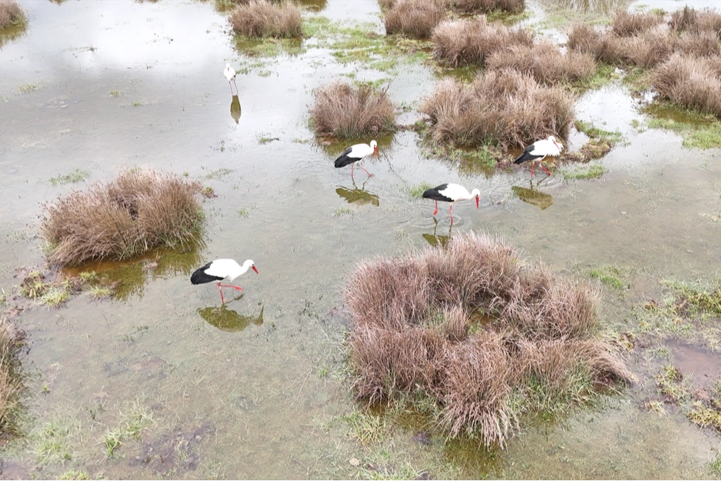 Sayıları yaklaşık 30'u bulan ve sürü halinde uçan leylekler, ovadaki sulak alana indi. Sulak alanda uzun süre kalarak beslenen leylekler, ilgi odağı oldu. Leyleklerin sulak alanda dolaşmaları ve yiyecek aramaları dronla görüntülendi.
