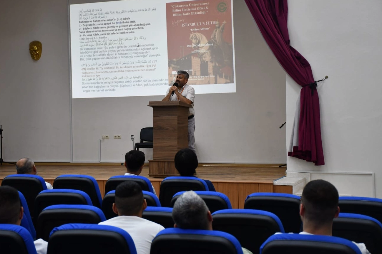 İstanbul’un fethinin 572. yılı dolayısıyla düzenlenen “İstanbul’un Fethi, Fetih ve Affetme” konulu konferansta, Çukurova Üniversitesi İlahiyat Fakültesi Öğretim Üyesi Doç. Dr. Ali Hatalmış, cezaevindeki hükümlülerle bir araya geldi. Bilim İletişimi Ofisi tarafından gerçekleştirilen ilk Bilim Kafe etkinliği olan konferansta, hem Türk hem de dünya tarihi açısından büyük öneme sahip İstanbul’un Fethi tarihi ve manevi boyutlarıyla ele alındı.