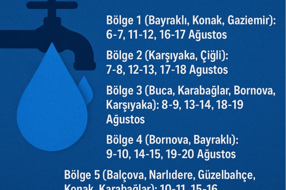 İZSU’nun açıkladığı planlı su kesintisi takvimiyle Bayraklı, Konak, Gaziemir, Karşıyaka, Çiğli, Buca, Karabağlar, Bornova, Balçova, Narlıdere ve Güzelbahçe ilçelerinde gece 23.00-05.00 saatleri arasında su kesintisi yaşanacak. Kesinti tarihleri ve etkilenecek mahalleler detaylarıyla haberimizde....