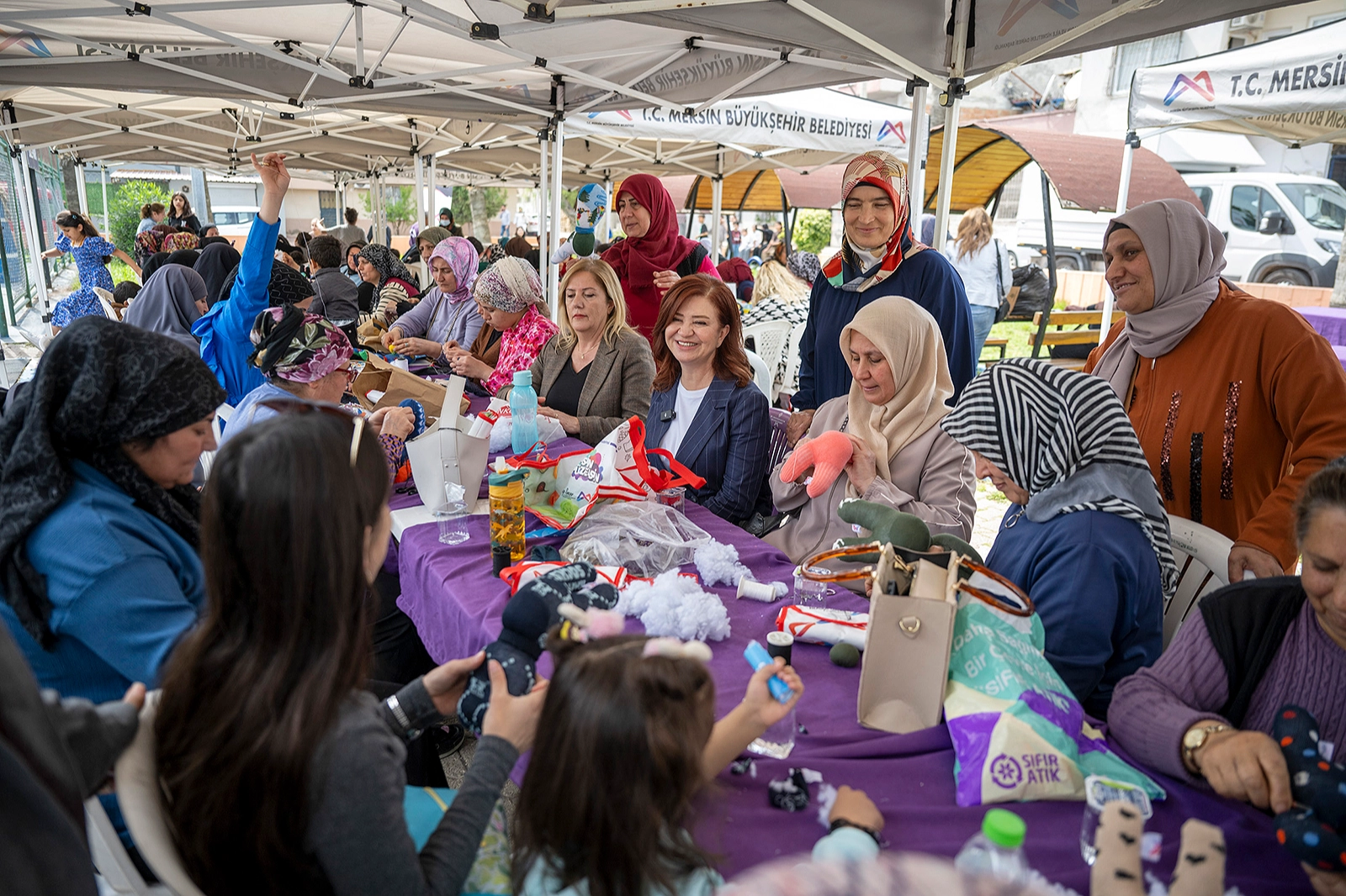 Atölye çalışmasında, İklim Değişikliği ve Sıfır Atık Dairesi Başkanlığı’nda görevli Çevre Mühendisi Berkay Işık; sıfır atık, atık yönetimi ve çevre bilinci konularında kısa bir bilgilendirme yaptı. Katılımcılar üretim süreçlerinde geri dönüşümün önemine dair bilgiler edindi. Atölye süresince kadınlar üretim yaparken, çocuklar için de eğlenceli bir oyun alanı oluşturuldu. Görevlilerce su tasarrufu hakkında da bilgilendirme yapılırken, MESKİ maskotu ile keyifli vakit geçiren çocuklar da halat çekme oyununda kıyasıya rekabet etti. Minikler ayrıca boya etkinliği ile günlerini renklendirdi. Mersinden Kadın Kooperatifi Yönetim Kurulu Başkanı Meral Seçer, ‘Evimiz Atölye’ projesinin bugüne kadar birçok mahallede kadınlarla buluştuğunu belirterek, muhtarların talebi doğrultusunda mahallelerde kadınları bir araya getirmeye devam ettiklerini söyledi. Projenin, Kadın ve Aile Hizmetleri Dairesi Başkanlığı Gönüllüler Şube Müdürlüğü ile Mersinden Kadın Kooperatifi iş birliğinde yürütüldüğünü ifade eden Seçer, mahallelerde kadınlarla birlikte çalışmaktan büyük mutluluk duyduklarını dile getirdi.