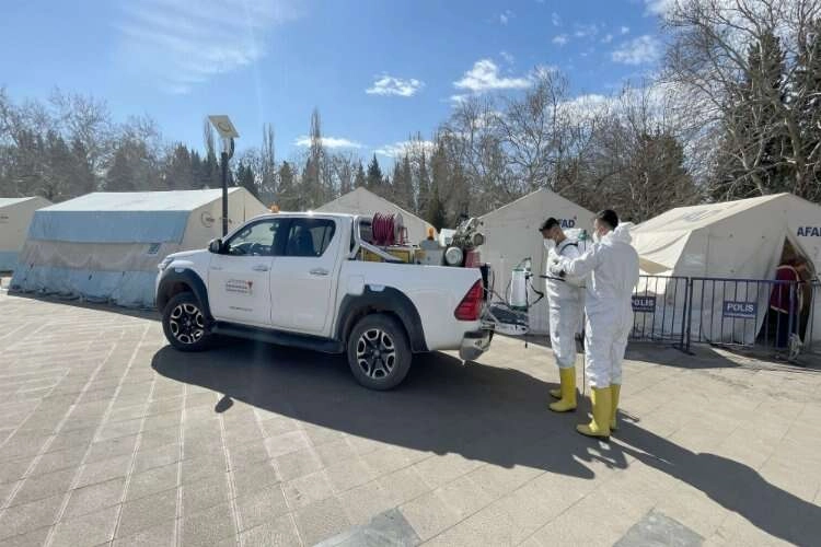 Ekipleri, çadır ve konteyner kentler başta olmak üzere tuvalet, banyo gibi ortak kullanım alanlarını özel ilaçlarla dezenfekte ediyor. Yaklaşık 200 araçla çalışmalarını yürüten ekipler, aralıksız hizmet veriyor.