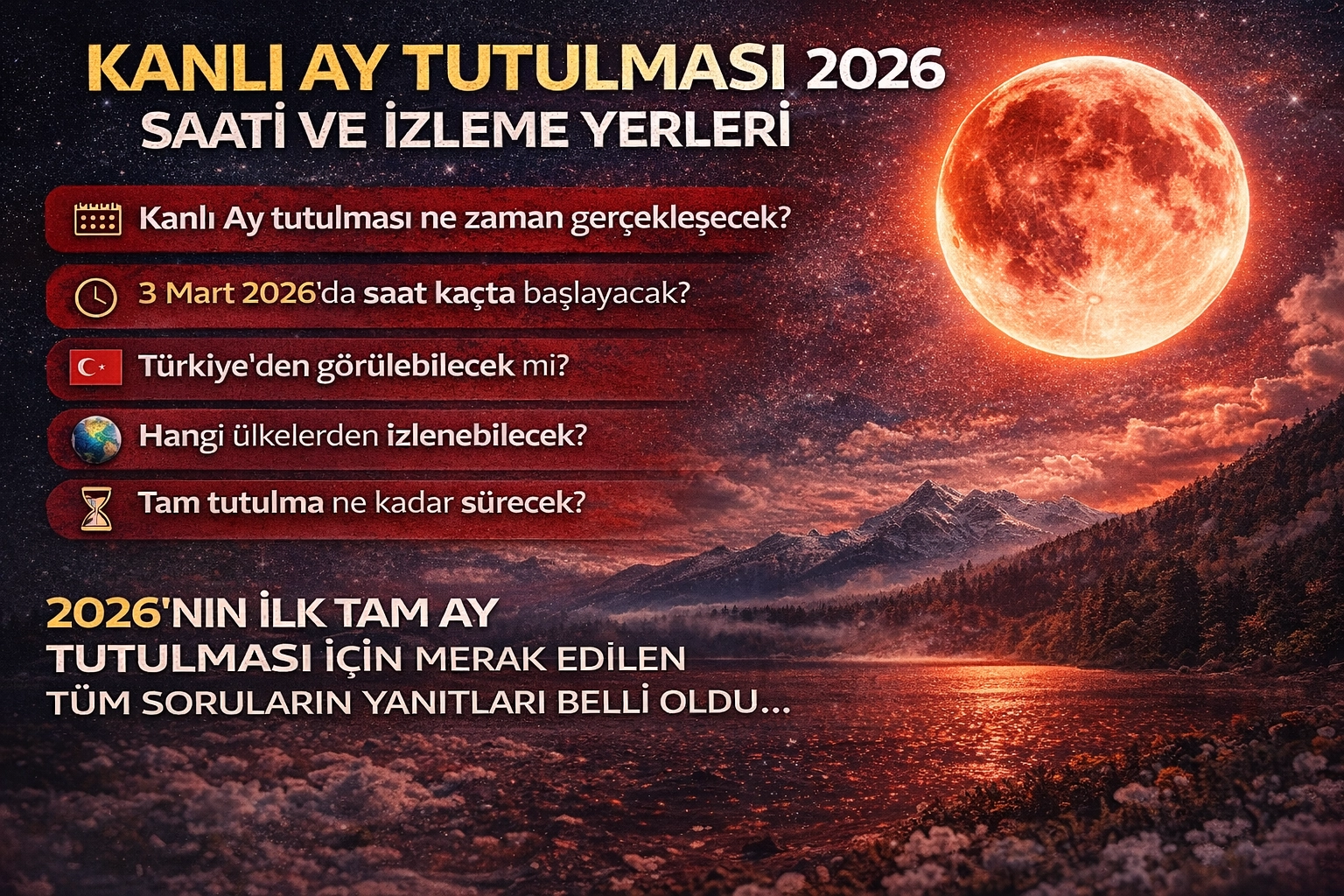 KANLI AY TUTULMASI TÜRKİYE’DEN GÖRÜLECEK Mİ?Ne yazık ki 3 Mart 2026 Tam Ay Tutulması Türkiye’den çıplak gözle izlenemeyecek. Tutulmanın büyük bölümü Türkiye saatiyle gündüz vakitlerine denk geldiği için Ay ufkun altında kalacak veya Güneş ışığı nedeniyle gözlemlenemeyecek.