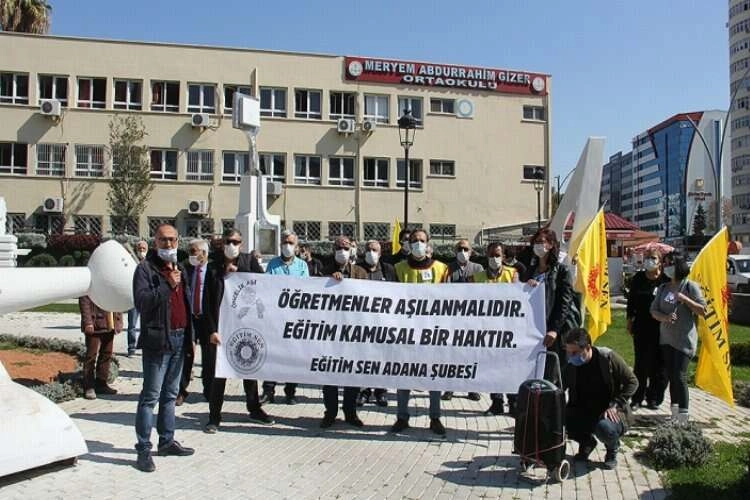 Adana Büyükşehir Belediyesi önünde bulunan Heykelli Park içerisinde bir araya gelen Eğitim Sen üyeleri adına basın açıklaması metnini Eğitim Sen Adana Şube Başkanı Hüseyin Kaya okudu. Eğitim çalışanlarının aşılanmasına başlansa bile aşılama sürecinde henüz somut bir ilerleme ortaya çıkmadığını dile getiren Kaya, “Eğitim ve Bilim Emekçileri Sendikası olarak sürekli, eğitimin yüz yüze olması gerektiğinin altını çizerek ancak bunun COVID-19 salgını ile mücadeleye uygun tüm önlemlerin hızla planlanması ve hayata geçirilmesi ile birlikte mümkün olabileceğini belirttik” dedi.